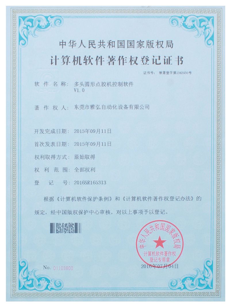 多頭圓形點膠機控制軟件證書